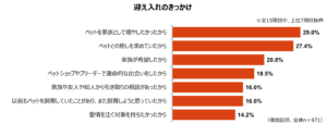 ペットの迎え入れのきっかけとして最も多かったのは「ペットを家族として増やしたかったから」が29.0%となり、ペットの家族化への意識が感じられます。次いで「ペットとの癒しを求めていたから」が27.4%でした。そのほか、「家族が希望したから」(20.8%)、「ペットショップやブリーダーで運命的な出会いをしたから」(18.5%)、「家族や友人や知人から引き取りの相談があったから」(16.0%)といった、偶発的なきっかけも見られました。