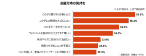 ペットのお迎え時の気持ちとして最も多かったのは「この子と暮らすのが楽しみだ」で53.9%、次いで「この子との時間を大切にしたい」が48.3%でした。また、「ついにペットを飼育することができて嬉しい」(34.6%)など、喜びや期待の気持ちを示す回答が多く見られました。ほかには「この子の一生を守らないと」(39.9%)、「病気やケガに気を付けてあげたい」(23.9%)や「病気やケガをしないか不安だ」(21.8%)など、健康や安全に対する意識も挙げられています。