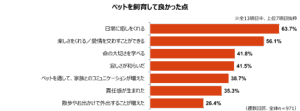ペットを飼育して良かった点として最も多かったのは「日常に癒しをくれる」の63.7%で、次いで「楽しさをくれる/愛情を交わすことができる」が56.1%でした。多くの飼育者にとってペットの存在が心の支えとなっている様子が窺えます。そのほか、「命の大切さを学べる」(41.8%)、「責任感が生まれた」(35.3%)など、情操面での成長を実感する声も多く挙げられました。また、「寂しさが和らいだ」(41.5%)、「ペットを通して、家族とのコミュニケーションが増えた」(38.7%)の回答からは、ペットが人とのつながりを深め、心の安定にも寄与している様子が窺えます。