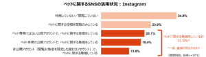 Instagramでペットに関する発信をしている飼育者は合計で51.5%にのぼり、過半数がSNS上でペットとの日常を共有していることが分かりました。発信の方法としては、「ペット専用ではない公開アカウント」が20.1%で最も多く、「ペット専用の公開アカウント」(18.4%)や「非公開アカウント」(13.0%)も一定数見られました。