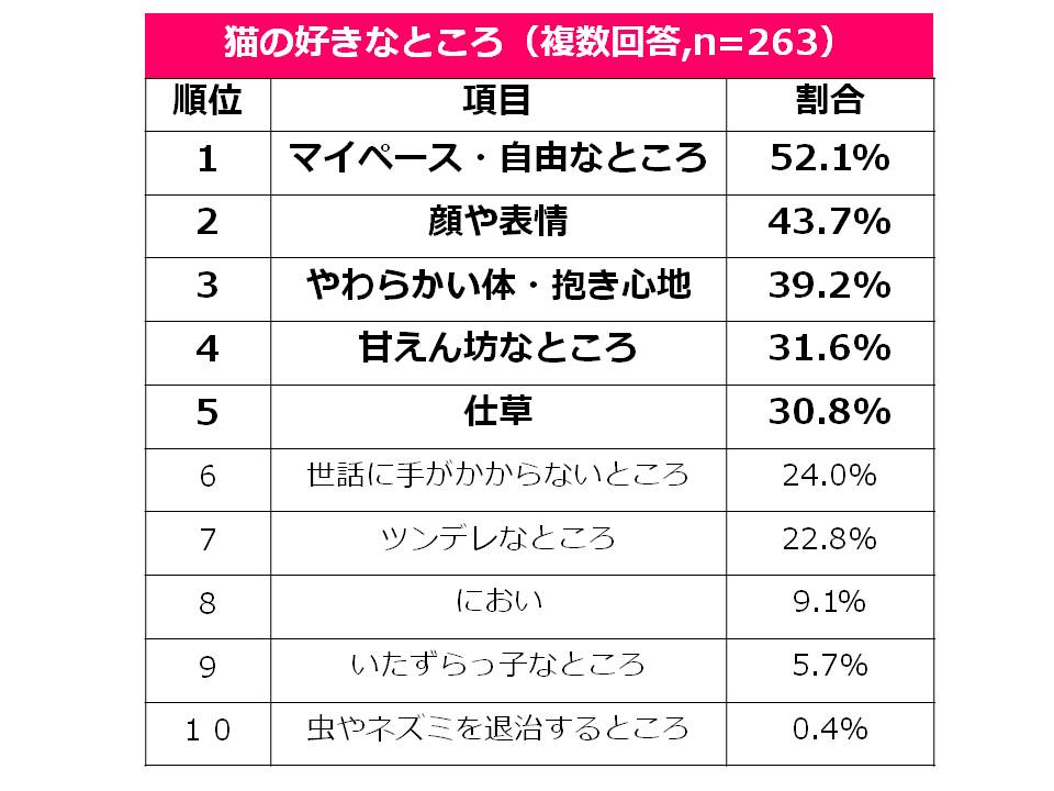 猫の好きなところをお聞きしました。半数以上の猫飼育者が猫の「マイペース・自由なところ」に魅力を感じていることが分かりました。好きな理由を聞いたところ、「適度な距離感がすき(40代・女性)」や「気まぐれな性格、ツンデレで飼い主を翻弄させるところが可愛い(30代・女性)」「自分の世界を持っているようで惹かれる(40代・男性)」という回答がありました。 ※「その他」「特になし」の回答を除く